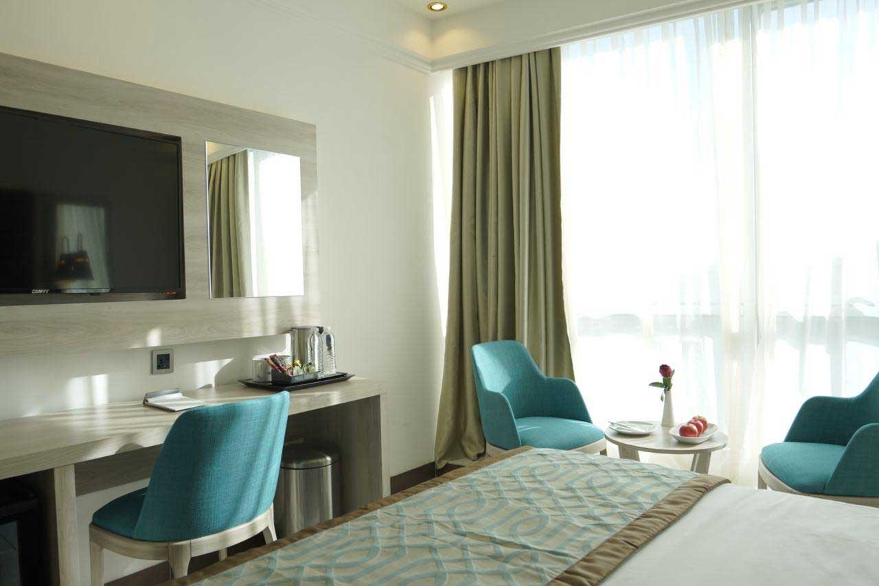 Deluxe Room is a standard 1 bed room with 24m2 space. This room designed with contemporary modern interior overlooking Al Arasat Street.